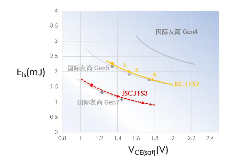 圖1 相同的電流電壓,不同代次芯片Vcesat&Ets表現(xiàn)「基于1200V/40A」