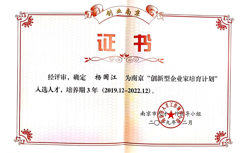 近日,公司楊國江董事長正式入選南京“創(chuàng)新型企業(yè)家培育計劃”。