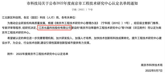 近日,南京市科學(xué)技術(shù)局發(fā)布了2022年度南京市工程技術(shù)研究中心認(rèn)定名單。江蘇長(zhǎng)晶科技股份有限公司被認(rèn)定為“南京市工程技術(shù)研究中心”。